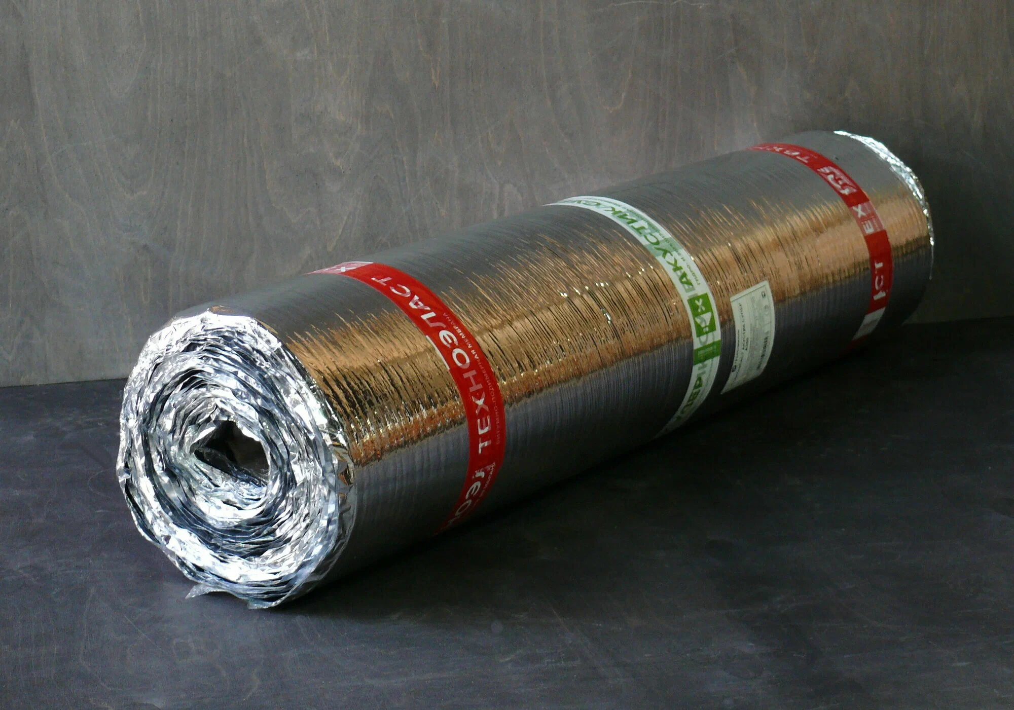 Техноэласт Акустик Супер А350 – звуко- гидроизоляционный материал, производится на основе из стеклохолста, на обе поверхности которой нанесено битумно-полимерное вяжущее, со слоем звукоизоляционного термоскрепленного полотна с одной стороны и металлизированной пленкой с другой стороны полотна.